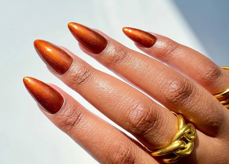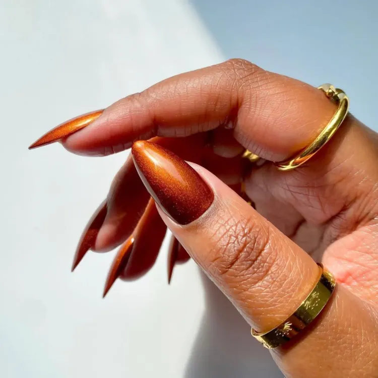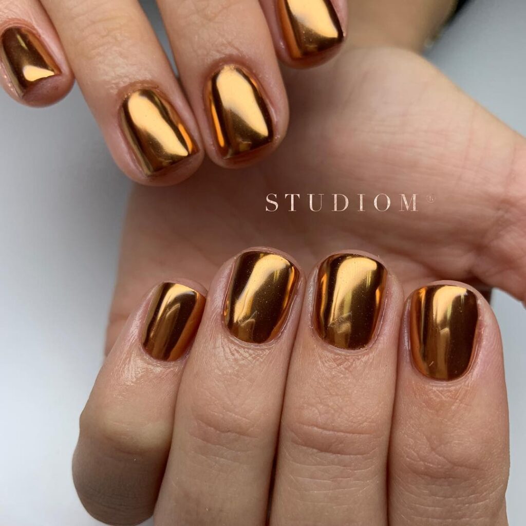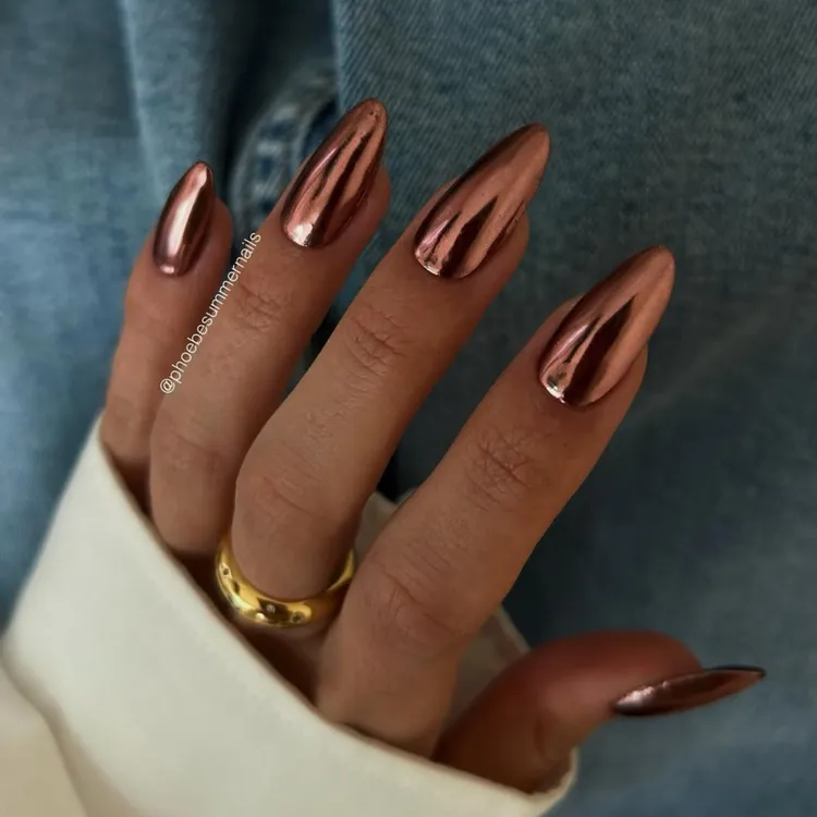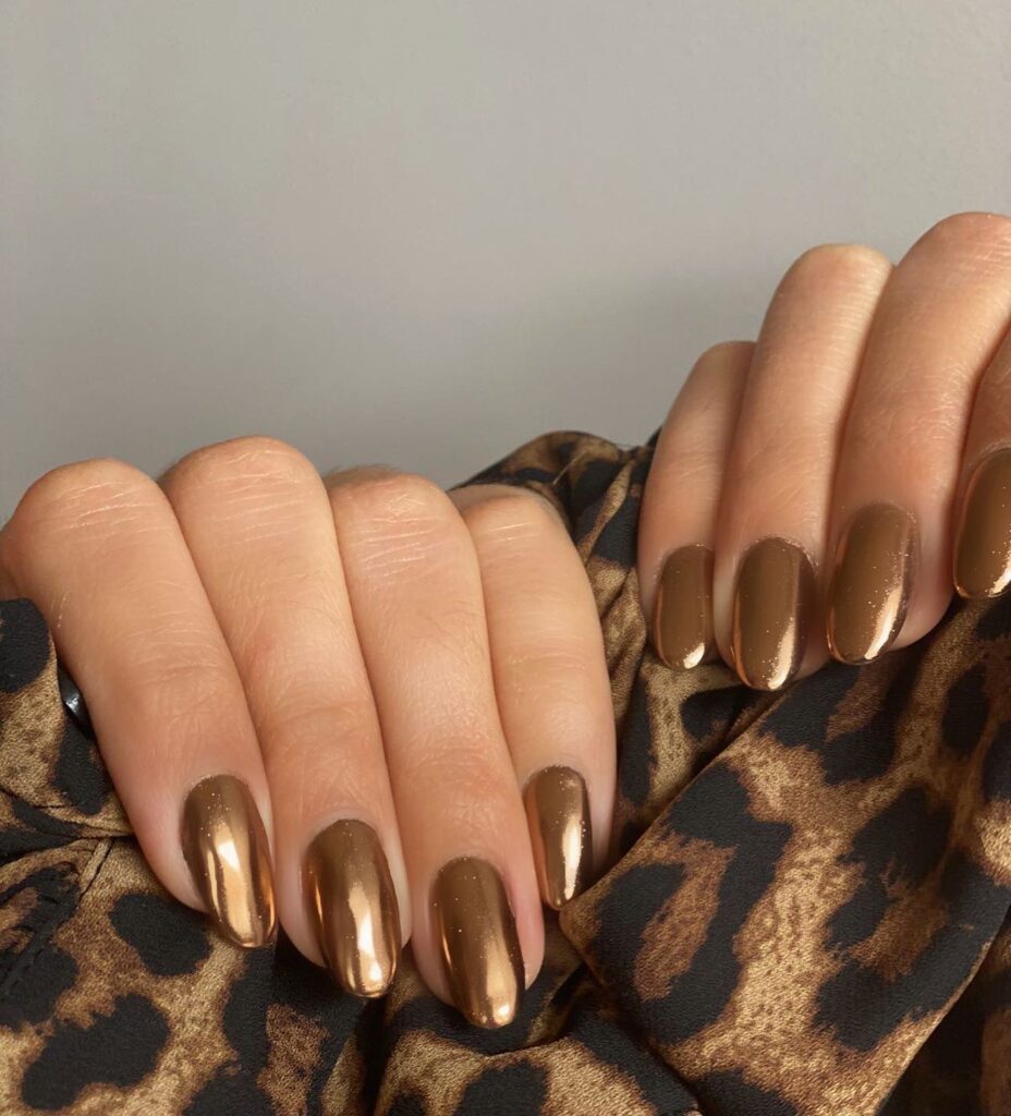 If you love futuristic looks, elevate your solid bronze nails by adding a chrome topper. This chrome finish adds extra shine and sophistication, making it a perfect choice as we transition into fall.