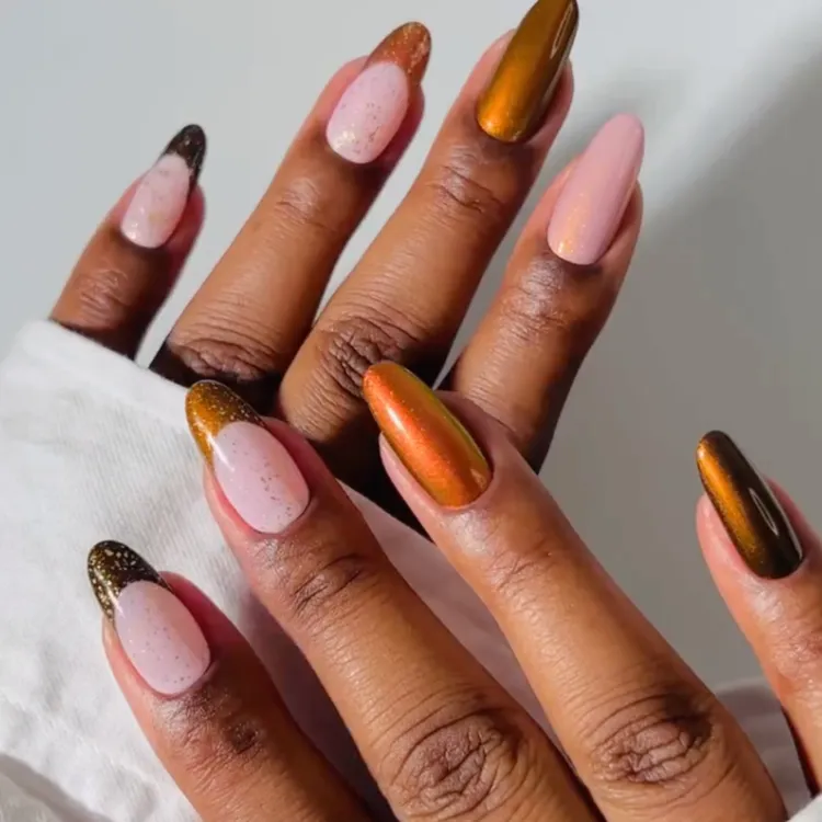 Give your traditional French manicure a chic update with different shades of bronze at the tips. Alternate between glittery tips and solid bronze nails for a unique and sophisticated twist on the classic style.