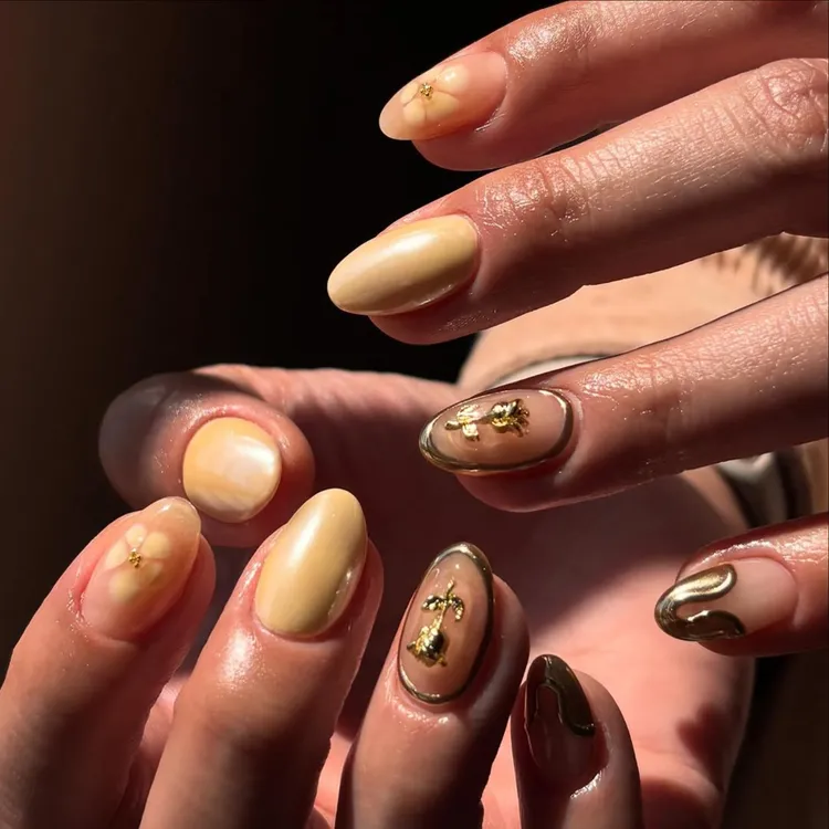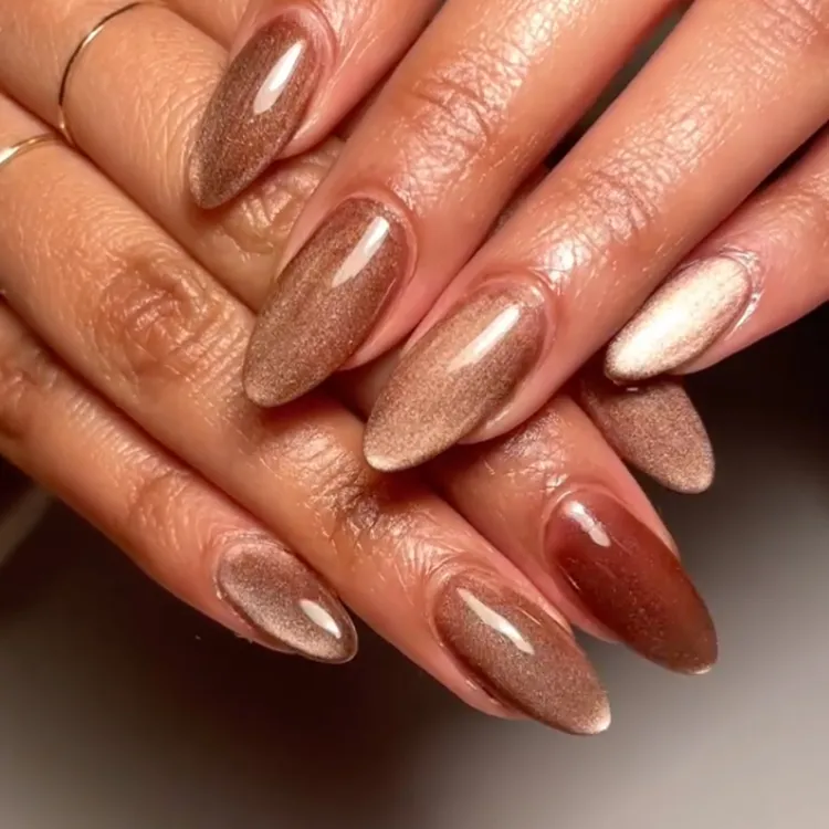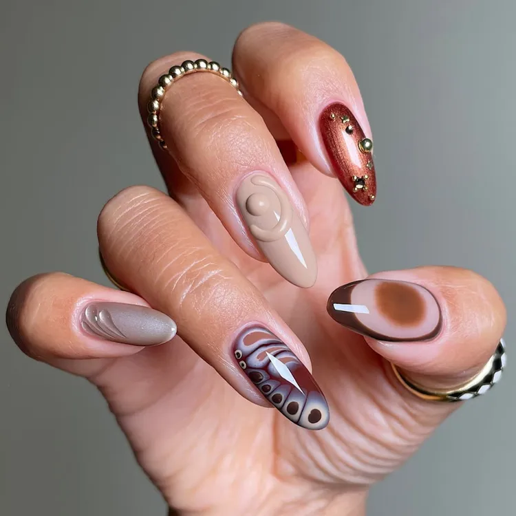 For a fun and creative vibe, try this latte-inspired design. Combining warm shades like oat milk, espresso, and rich chocolate with shiny bronze accents, this manicure offers a playful yet polished look.