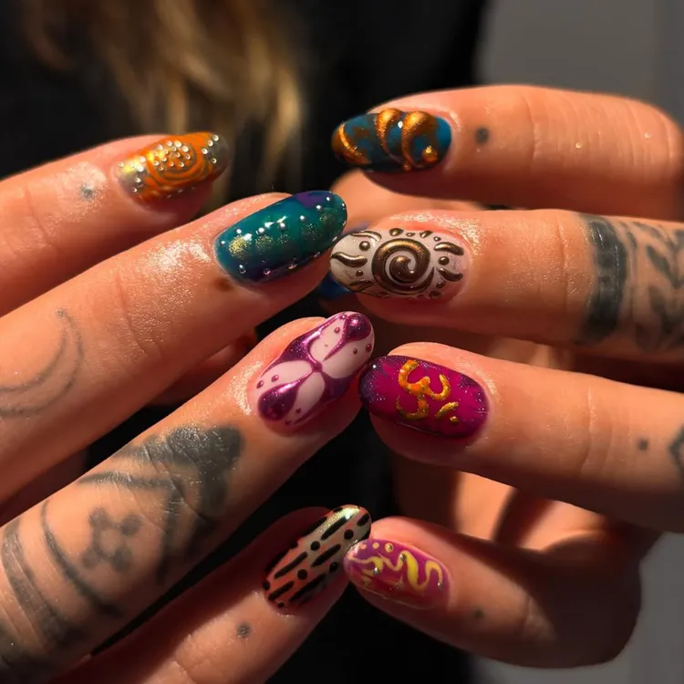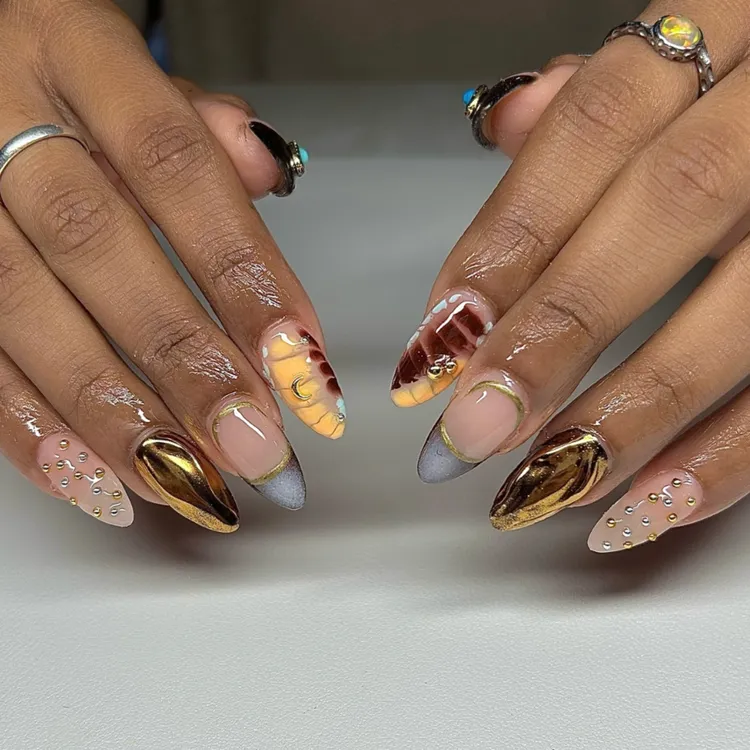 Take inspiration from the ‘90s and early 2000s with a bronzed sunburst design. The mix of colorful and neutral accents on each nail creates a nostalgic yet modern look, ideal for fashion-forward women.