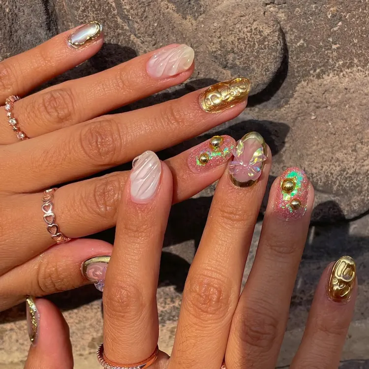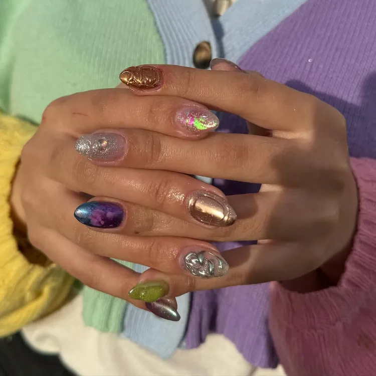 If you’re a fan of sparkle, a mix-and-match design is the way to go. Combine bronze chrome, holographic foil, and silver glitter for an eye-catching manicure that dazzles from every angle.