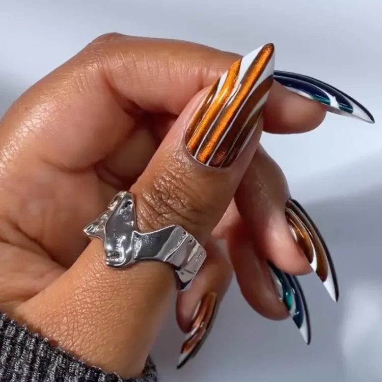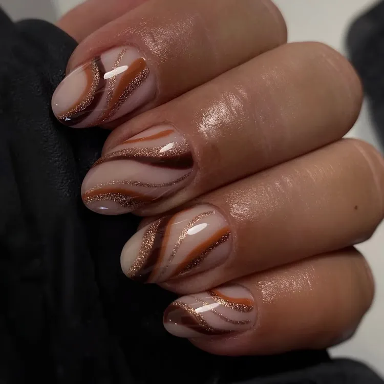 Add a touch of whimsy with bronze swirl designs. Pair shimmery bronze with chocolate brown and hazelnut hues on a milky white base for a subtle yet striking manicure that’s both elegant and fun.