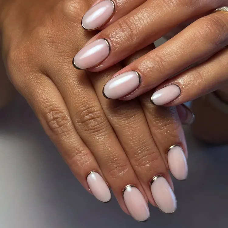 For those who appreciate minimalist beauty, this bronze-bordered design is the perfect choice. Frame your nails with a delicate bronze chrome hue over a glazed donut base for a simple yet sophisticated look.