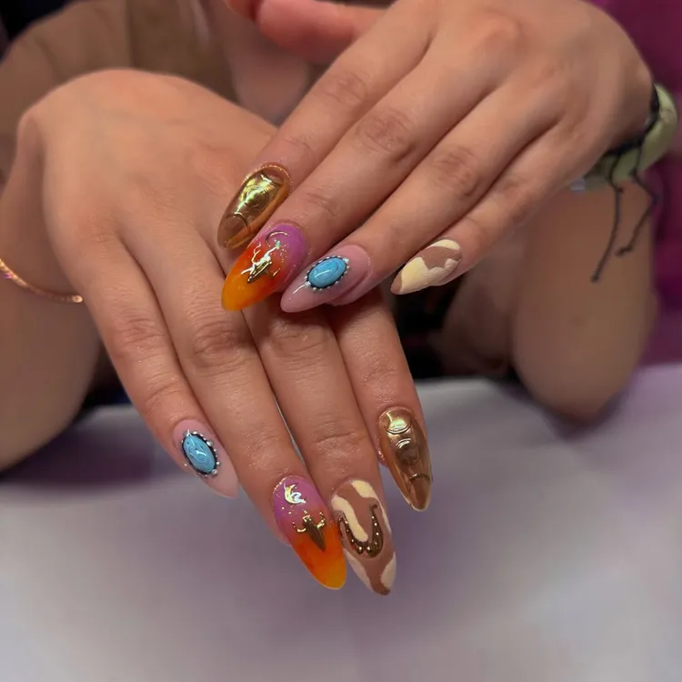 Add some Western flair to your nails with this bold, fun cowgirl-inspired design. Combining metallic accents and country motifs, this design is perfect for those who want a unique take on the bronze nail trend.