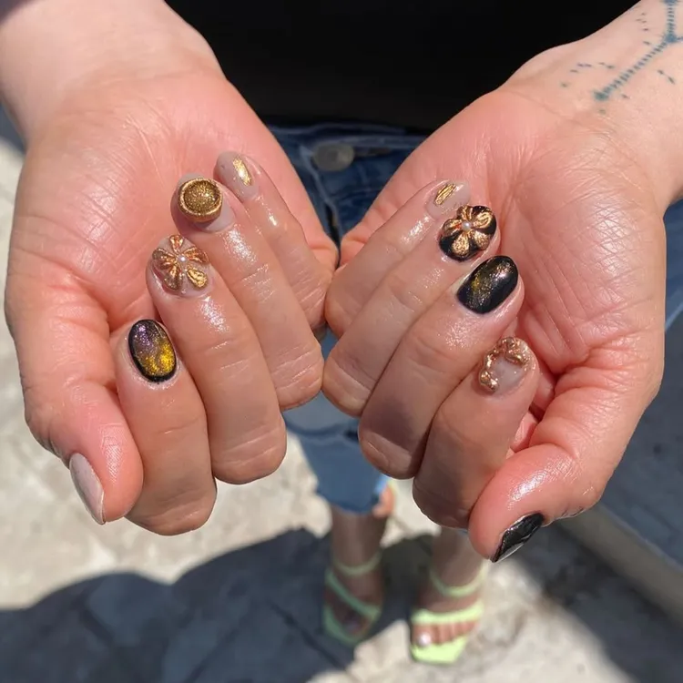 Who says short nails can’t be fun? This design features abstract nail art and 3D metallic florals, giving shorter nails a stylish and trendy makeover that’s perfect for any occasion.