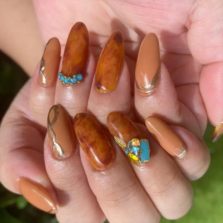 Add a boho-chic touch to your bronze nails with marble textures and turquoise gems. This bronzed marble design offers a natural, earthy aesthetic that’s perfect for women looking to combine luxury and laid-back style.