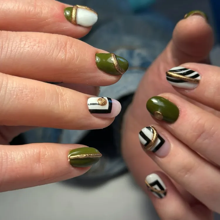 Create a high-fashion look with this bold contrast of olive and bronze. Abstract shapes painted with a nail art brush offer a chic, artistic touch that’s perfect for any woman who loves modern design.