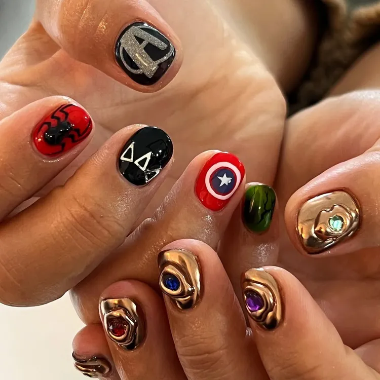 If you’re into playful designs, these 3D bronze nails inspired by Marvel superheroes are perfect for you! Add vibrant color and intricate details to your short nails for a bold, unique look.