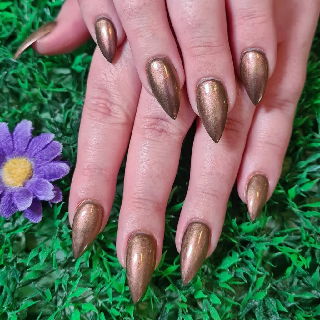These sharp, stiletto-shaped nails feature a stunning metallic bronze finish, creating a bold and sophisticated look. The smooth, glossy sheen makes them stand out, perfect for those seeking a fierce and elegant style.