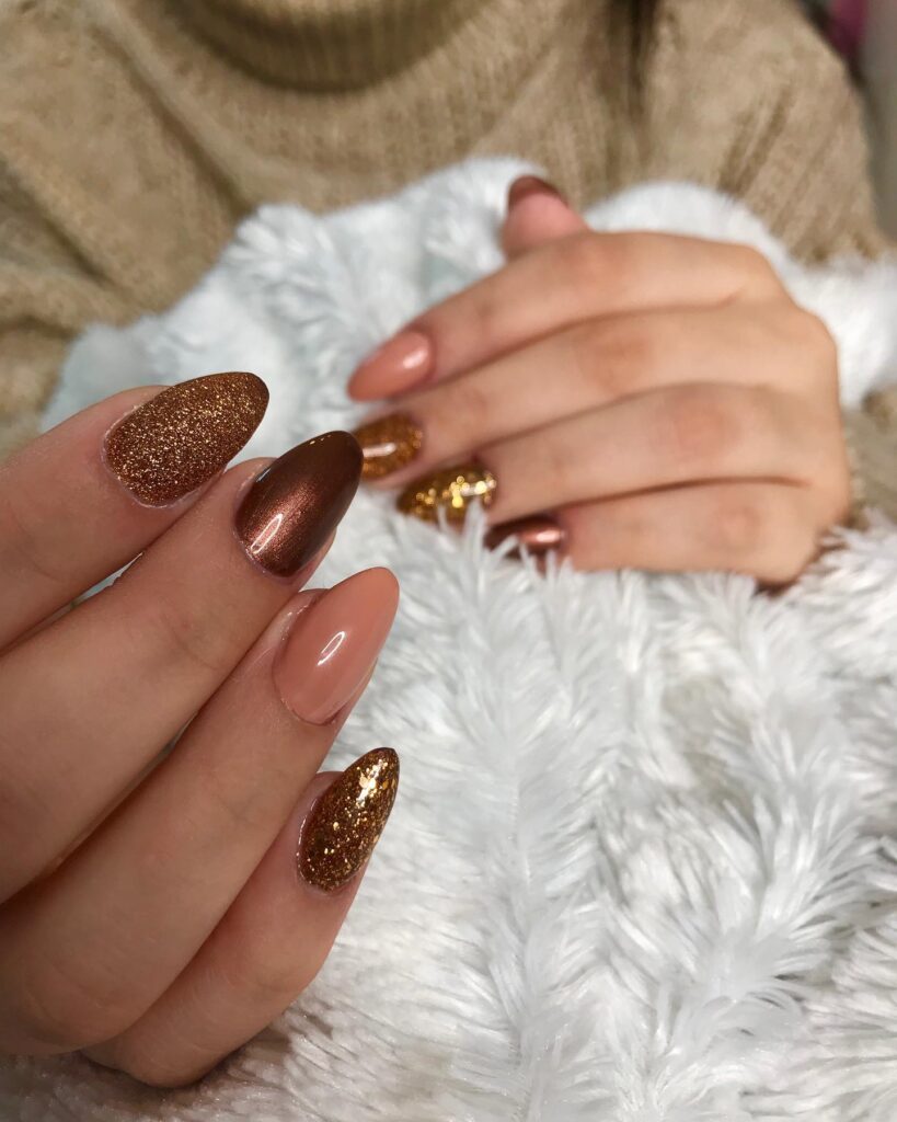 This manicure a chic mix of copper-toned metallic and sparkling glitter nails, combining elegance with a touch of glam. The warm, shiny hues and the glitzy accents create a bold yet sophisticated look.