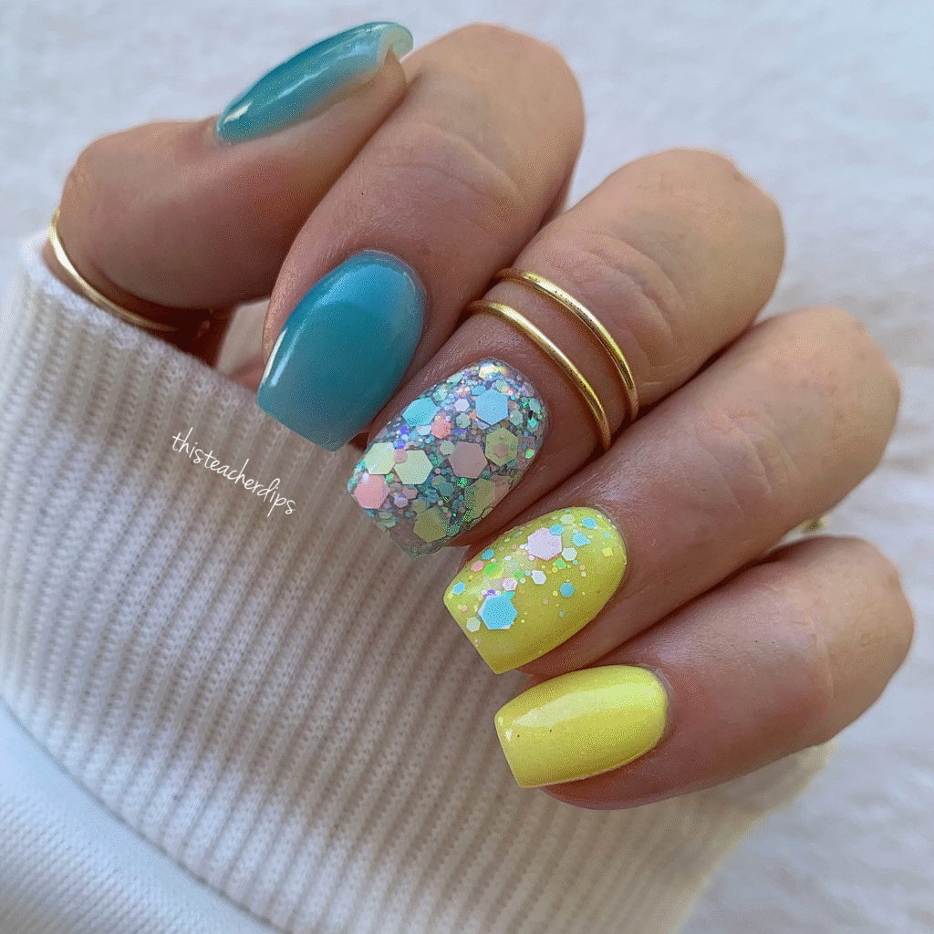 Soft pastels and glitter are a classic combination that always gives off a whimsical, fairy-tale vibe. Light shades like baby blue, lavender, soft pink, and pale yellow can be mixed with sparkling glitter to create a look that’s as dreamy as it is beautiful. These nails remind you of a fairy princess living in a magical world, surrounded by all the charm and whimsy you can imagine.
