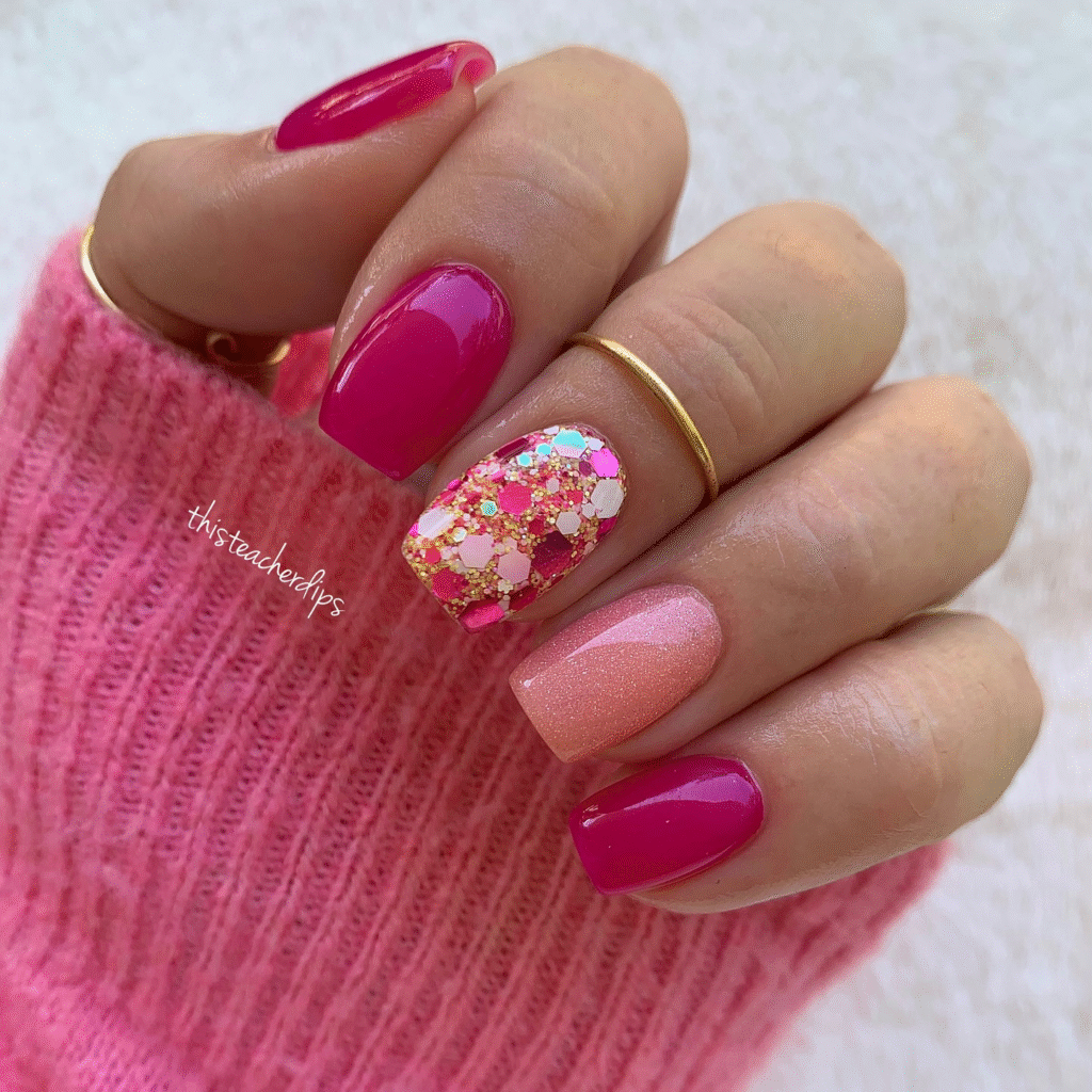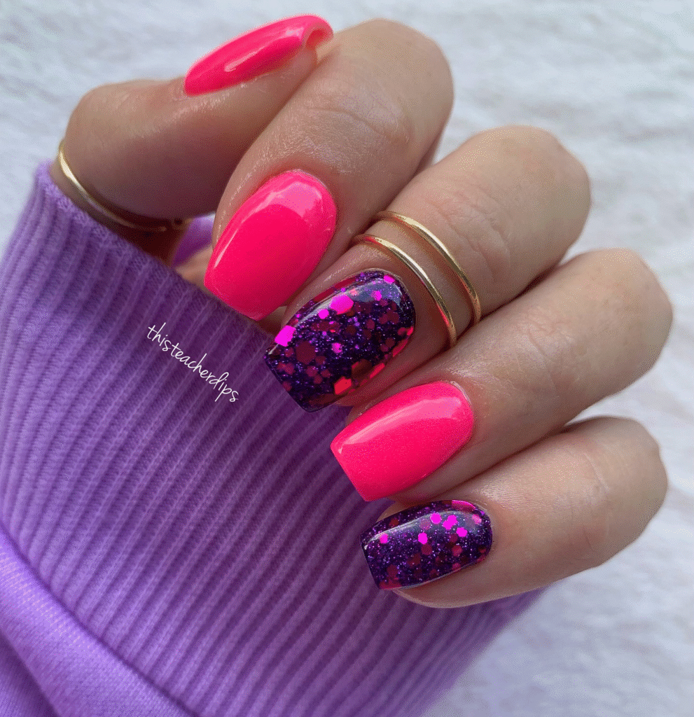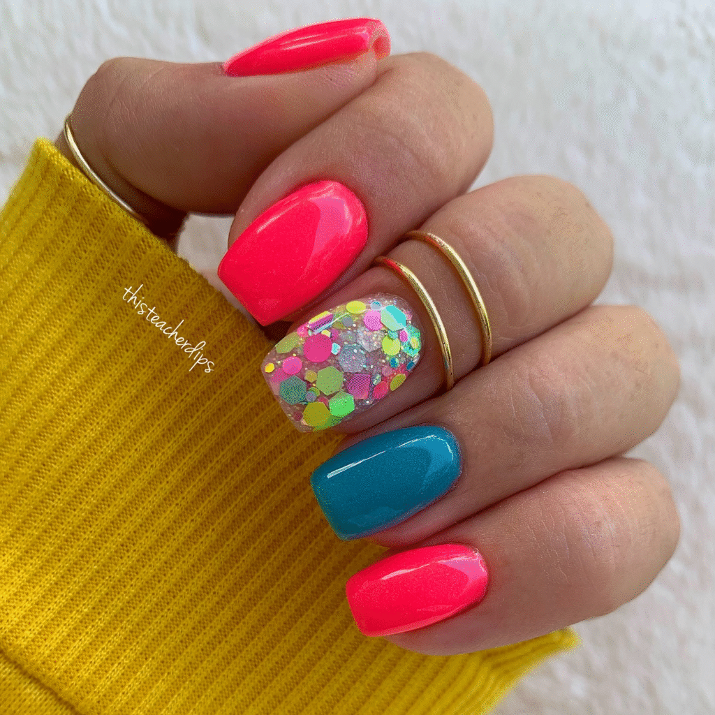 Vibrant neon pink and turquoise nails with a glittery accent nail, perfect for those who want a pop of color and fun!