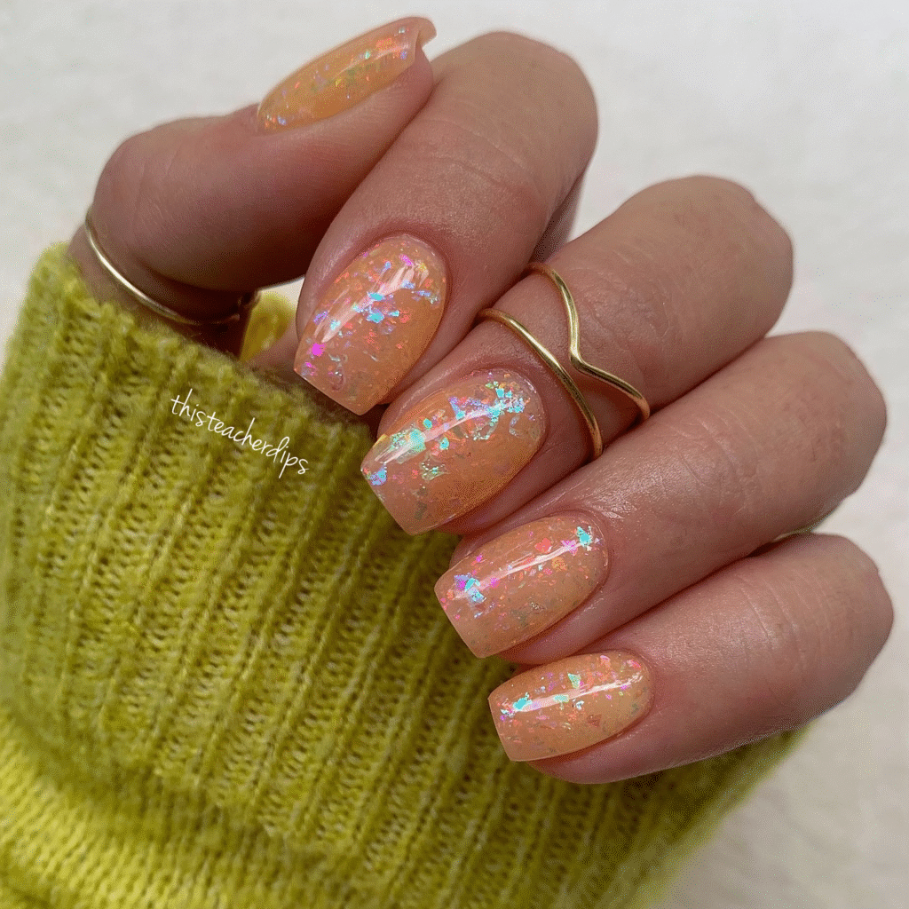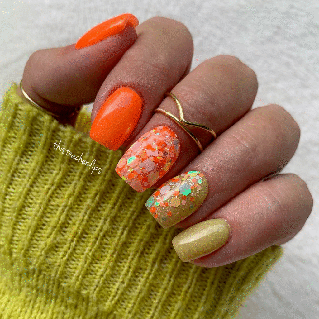 A blend of warm oranges and soft yellows with glittery accents, creating a tropical, sunset-inspired look.
