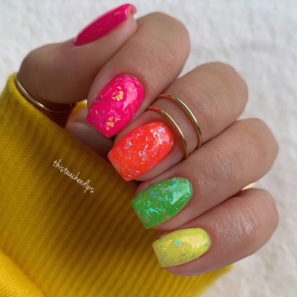 Bright neon pink, orange, green, and yellow nails with a playful, bold design. The bright colors and shimmering accents make these nails pop!